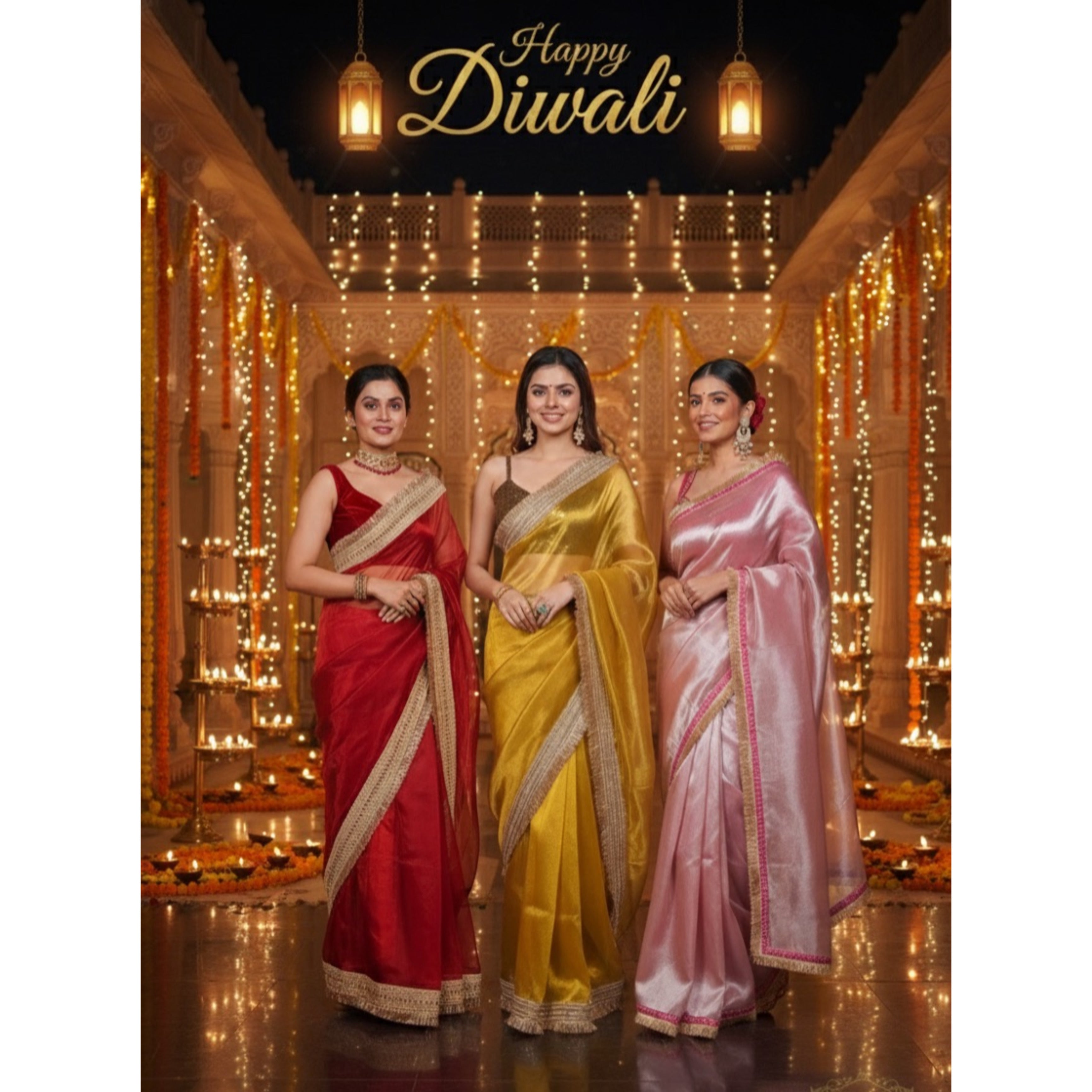Discover elegant glass tissue sarees with shimmer finish and lightweight drape. Perfect...