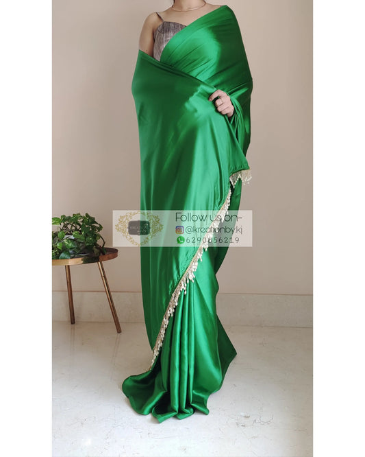 Parrot Green Satin Silk Saree With Handmade Tassels On Pallu