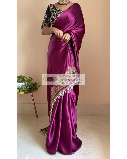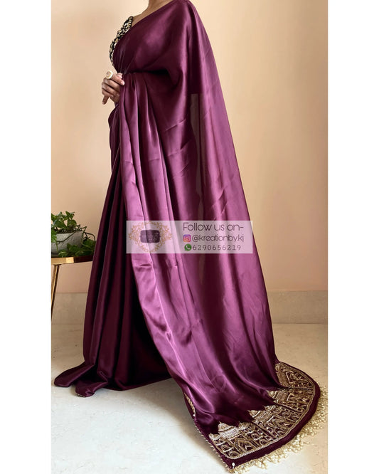 Dark Eggplant Wine Satin Silk Saree With Handmade Tassels On Pallu