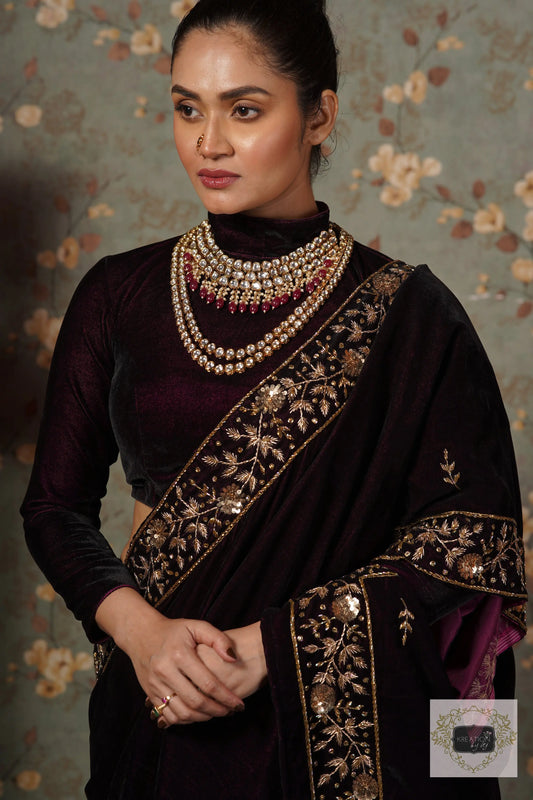 Dark Eggplant Wine Satin Silk Taj Mahal Saree