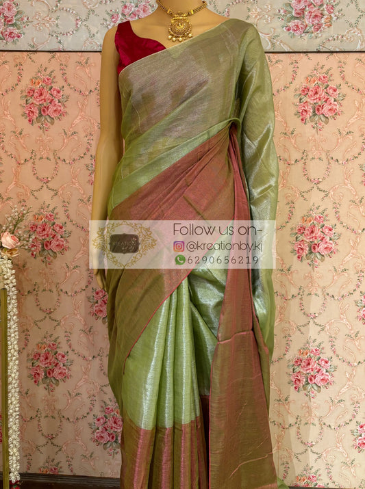 Ash Green Satin Silk Saree with Handmade Tassels on Pallu