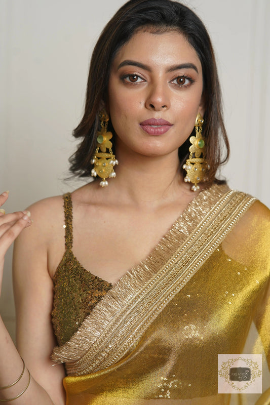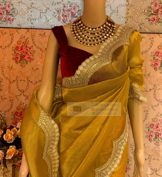 Golden Zari Tissue Saree With Handmade Tassels On Pallu