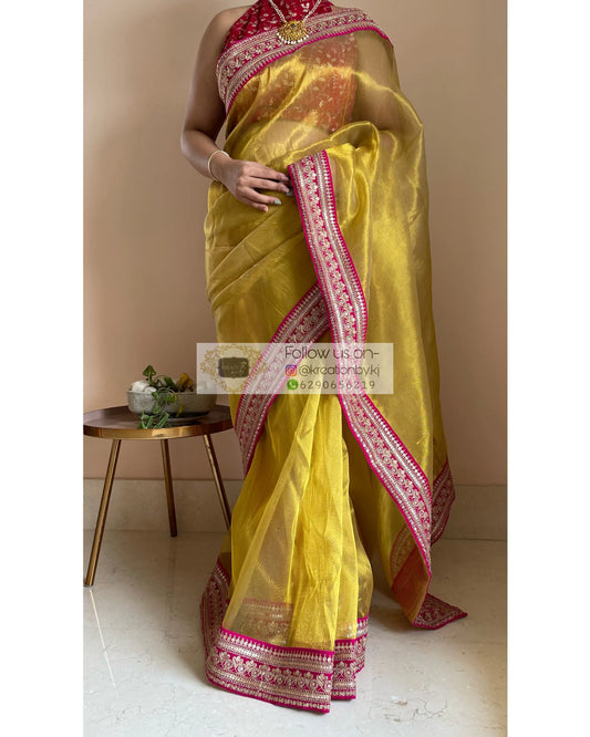 Golden Yellow Zari Tissue Banno Saree for Wedding