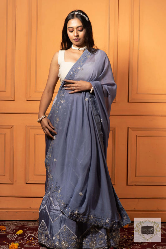 Grey Metallic Satin Shimmer Cocktail Saree for evening party