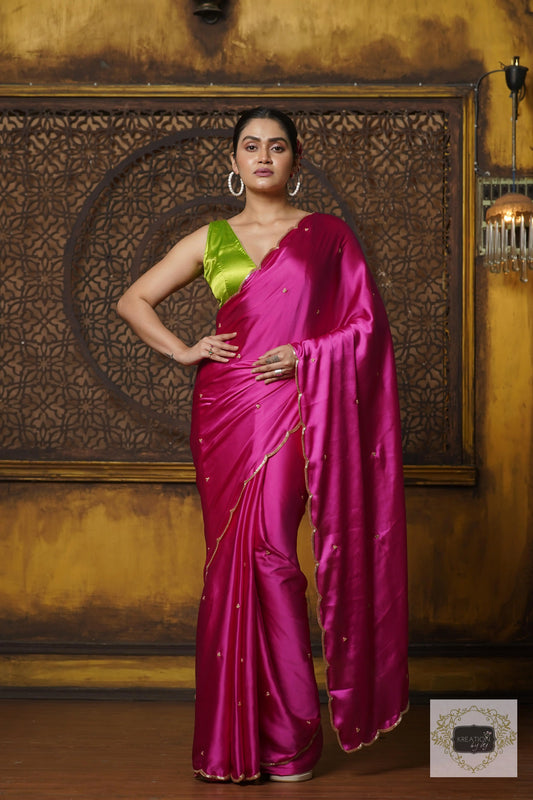 Hot Pink Satin Silk Saree With Handembroidered Scalloping