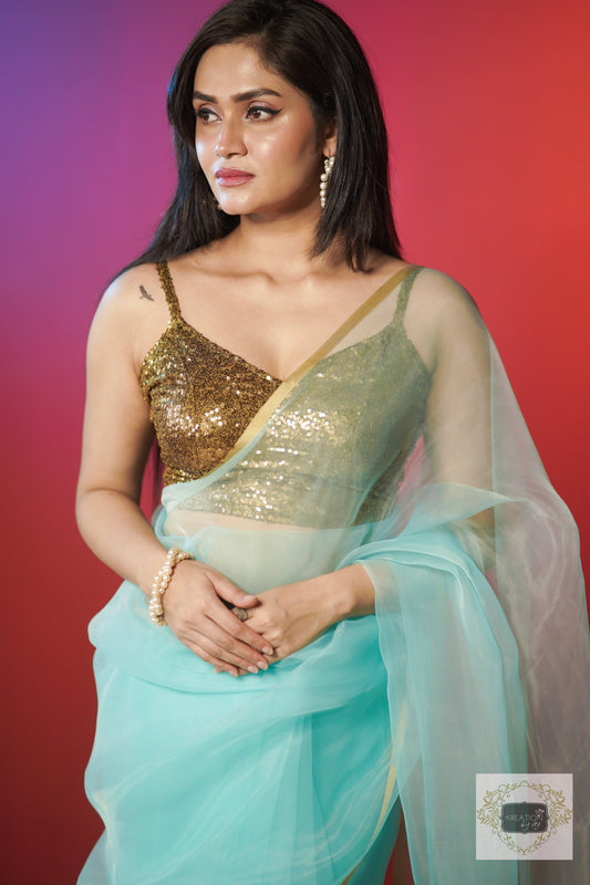 Ice Blue Organza Saree With Handmade Tassels On Pallu