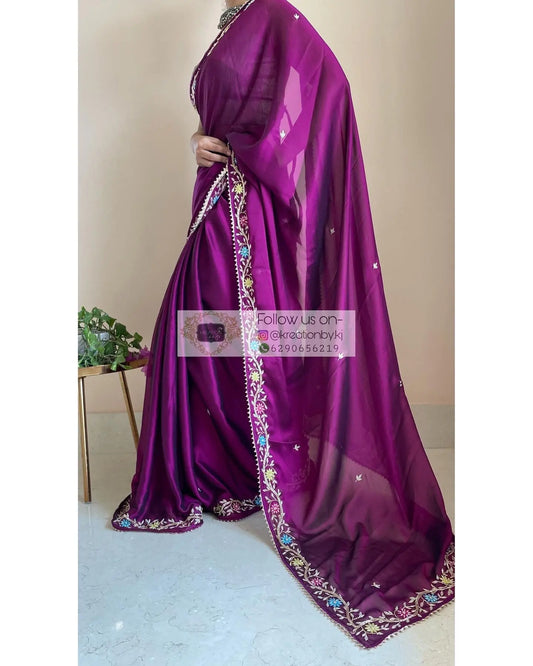 Wine Georgette Silk Saree With Zardosi Dabka Motifs