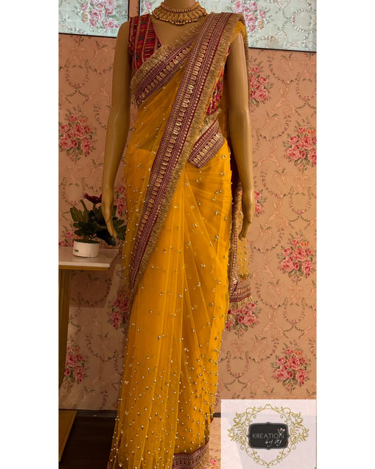 Yellow Gold Zari Tissue Mehraab Border Saree