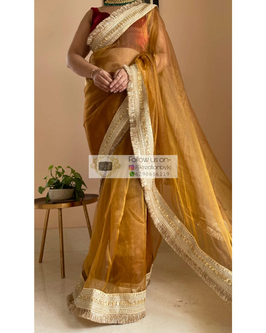 Fiery Gold Zari Tissue Mehraab Border Saree