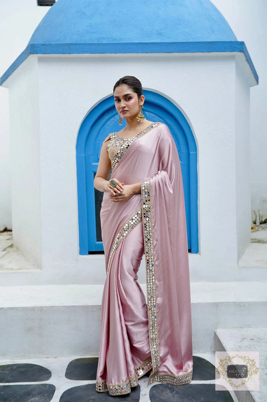 Lilac Satin Silk Saree with Cut Mirror work Lace