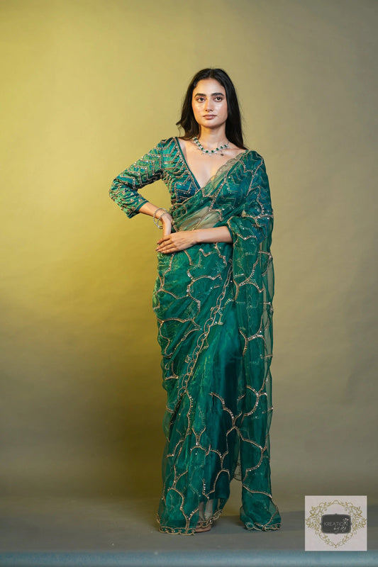 Bottle Green Shimmer Satin Sheesh Mahal Saree