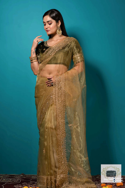 Liquid Gold Glass Tissue Kurmaie Saree for Engagement