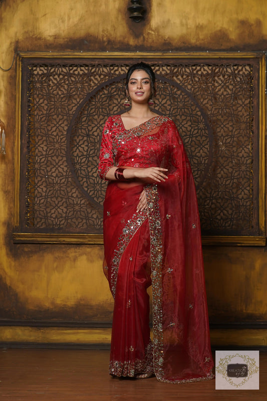 Save 24%Red Glass Tissue Sheesh Mahal Saree