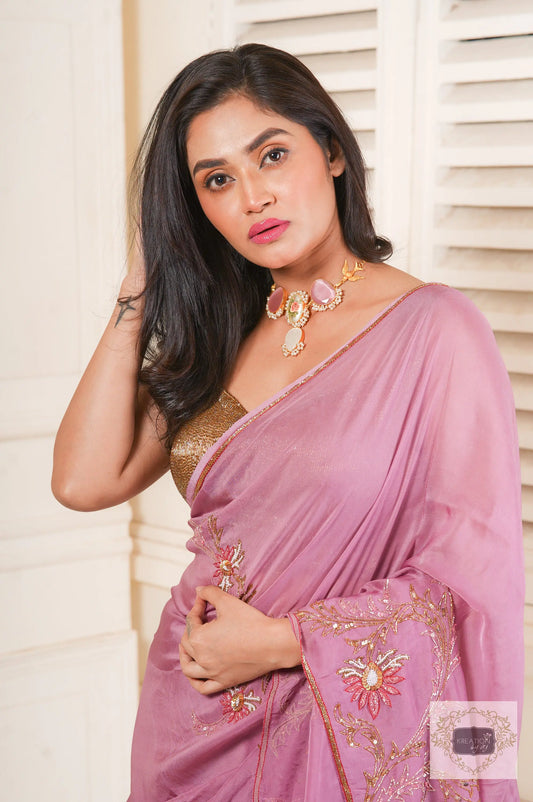 Mauve Diva Pure Organza Silk Saree with Handembroidery