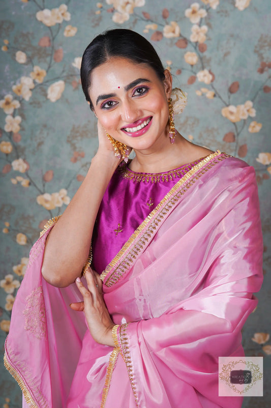Onion Pink Crepe Silk Zardozi Jaal Saree
