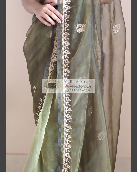MIlitary Green Glass Tissue Saree With Gota Patti Border