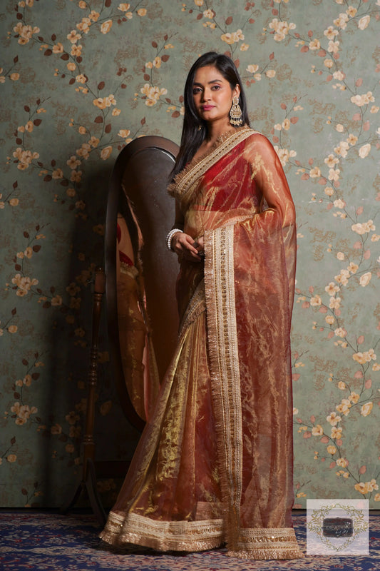 Golden Chocolate Glass Tissue Mehraab Border Saree