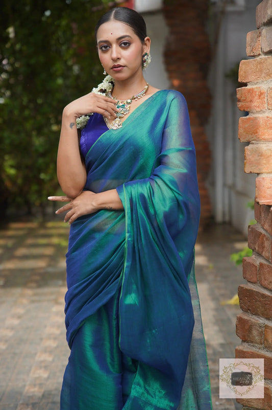 Morni Peacock Blue Cotton Tissue Saree
