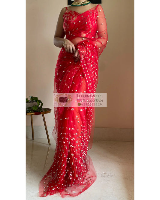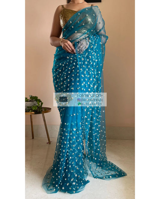 Jugnoo Teal Blue Net Designer Embellished Saree