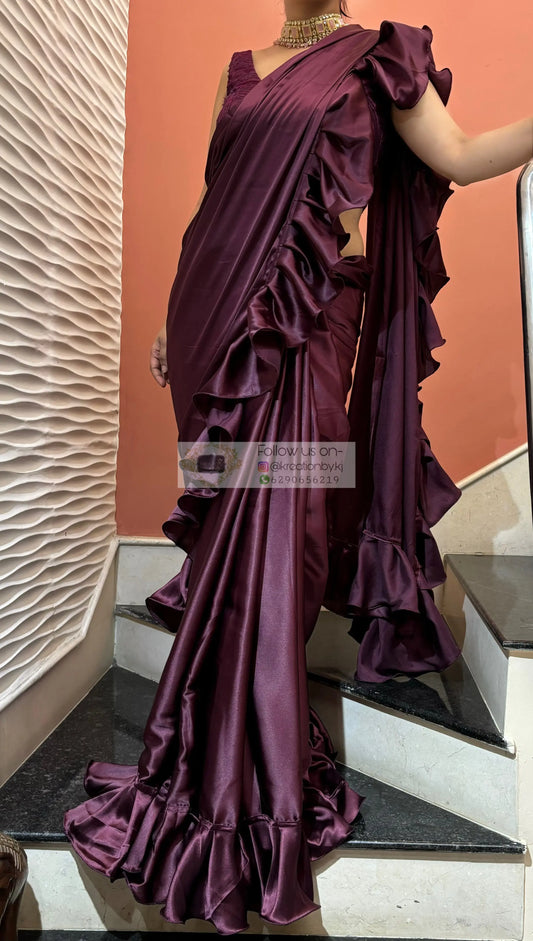 Dark Eggplant Wine Satin Silk Ruffle Saree