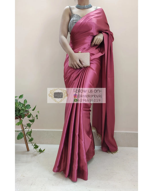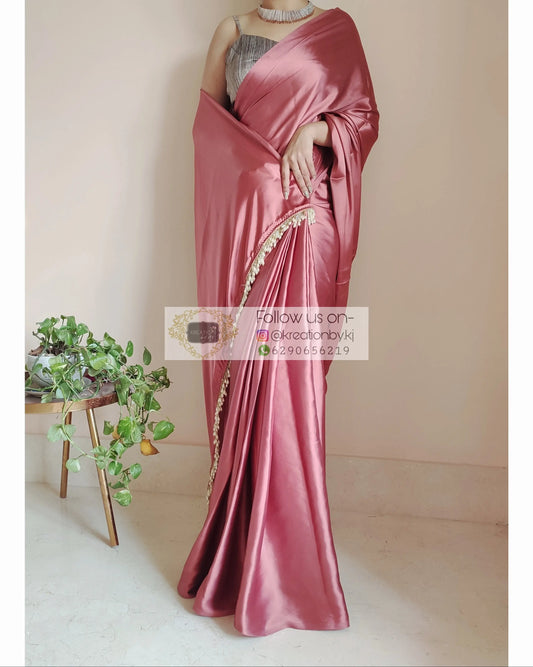 Dusty Rose Satin Silk Saree With Handmade Tassels On Pallu