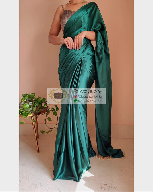 Bottle Green Satin Silk Saree With Handmade Tassels On Pallu