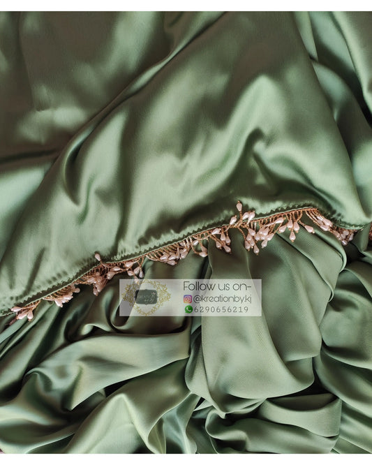 Moss Green Satin Silk Saree With Handmade Tassels On Pallu