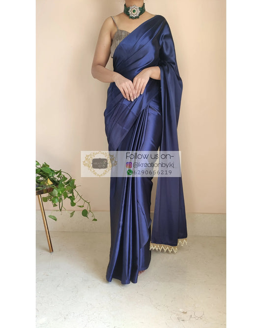 Navy Blue Satin Silk Saree With Handmade Tassels on Pallu