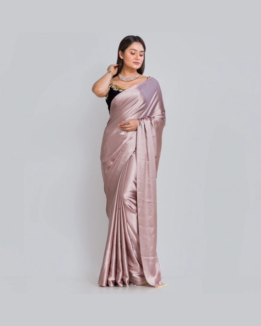 Rose Gold Satin Silk Saree With Handmade Tassels On Pallu