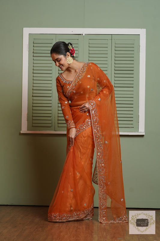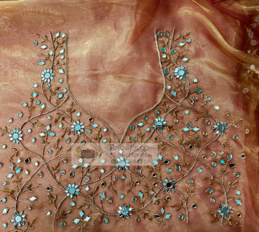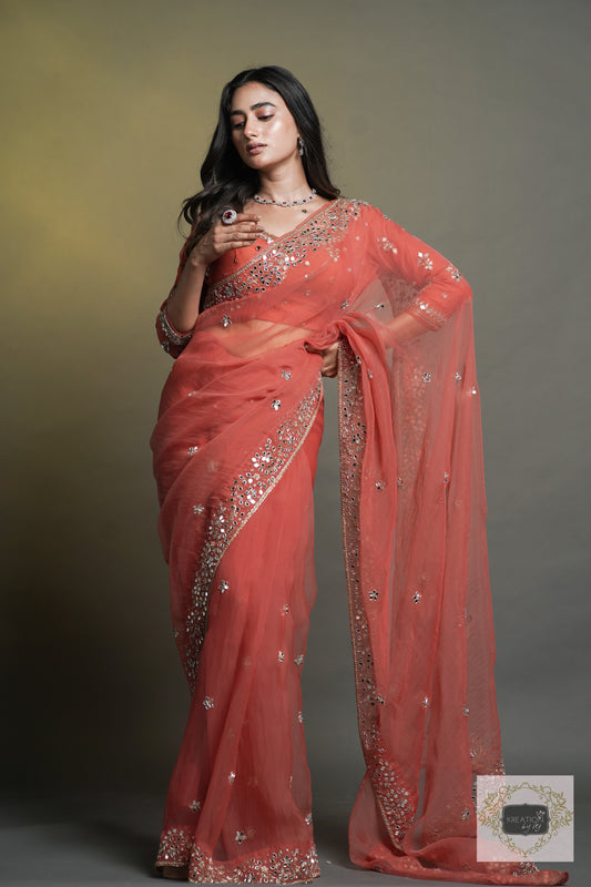 Peach Sheesh Leher Real Mirror Cutwork Saree for My Desi Girl