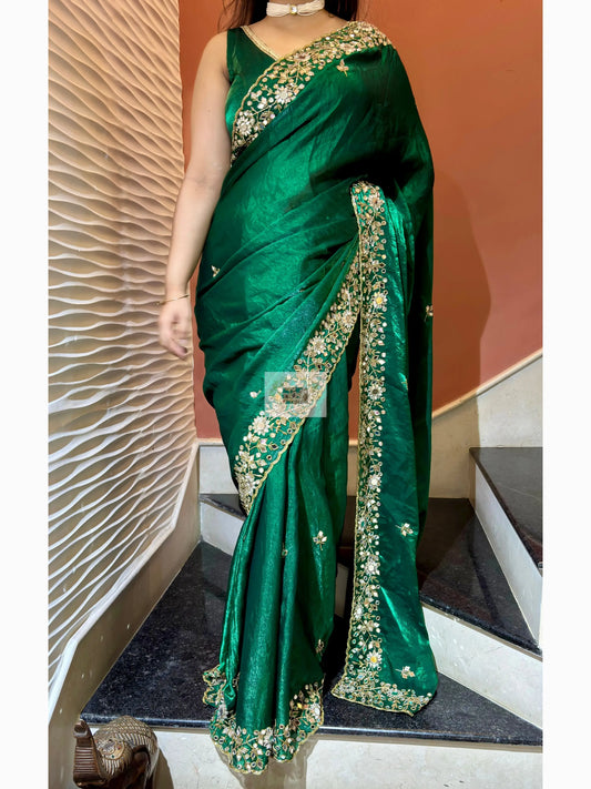 Bottle Green Shimmer Satin Sheesh Mahal Saree