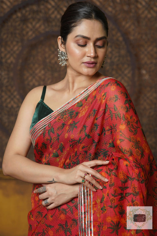 Orange Floral Kota Silver Lining Saree With Gota Border