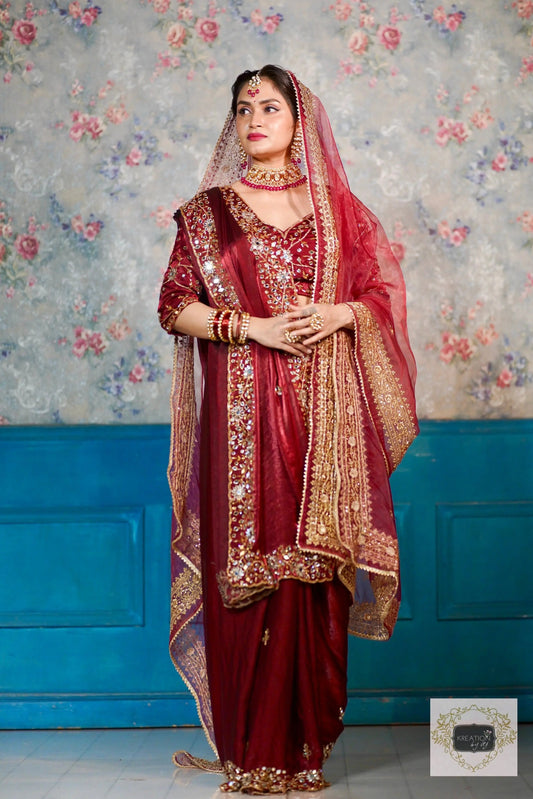Maroon Crepe Silk Badan pe Sitare Wedding Saree