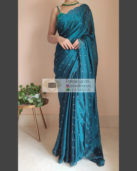 Teal Blue Georgette Silk Saree With Handembroidered Dabka Motifs On Border