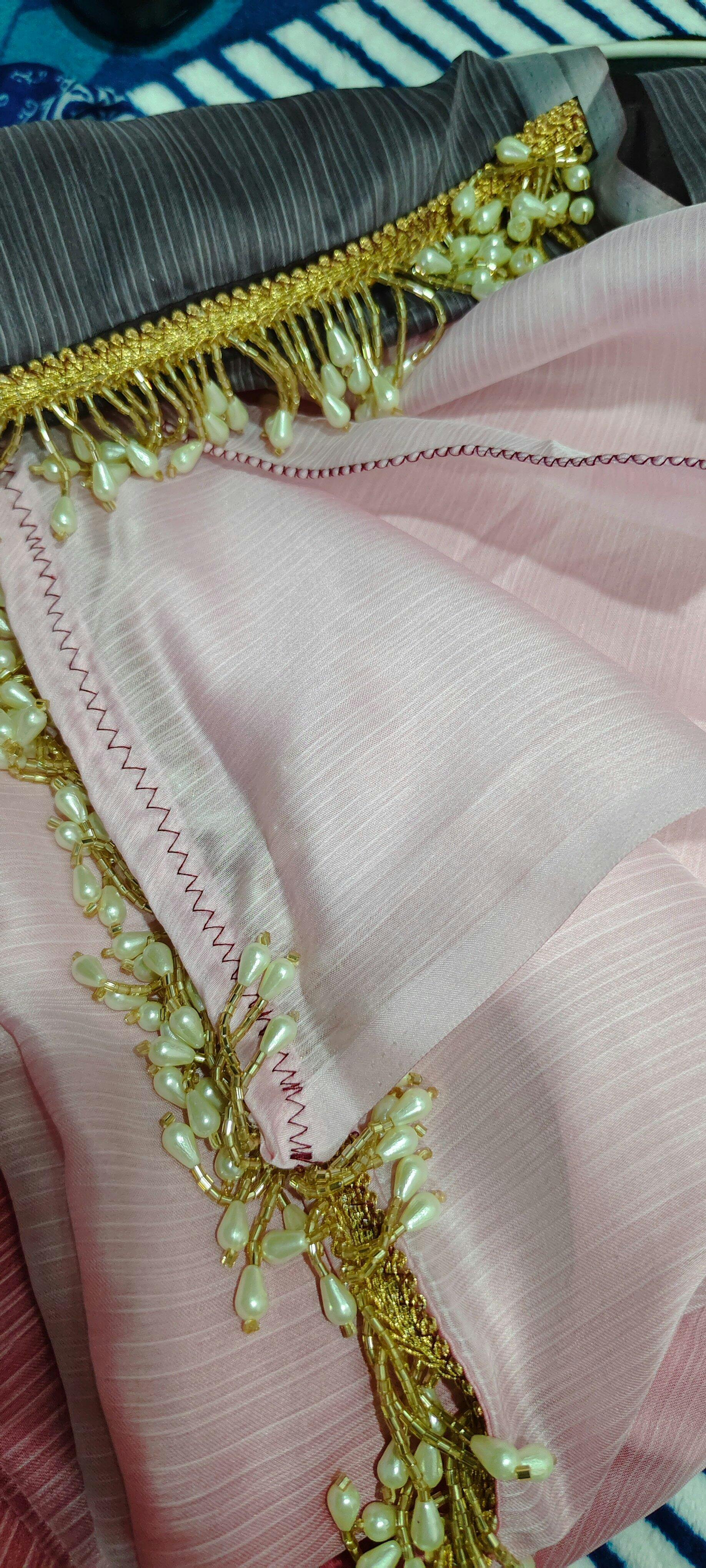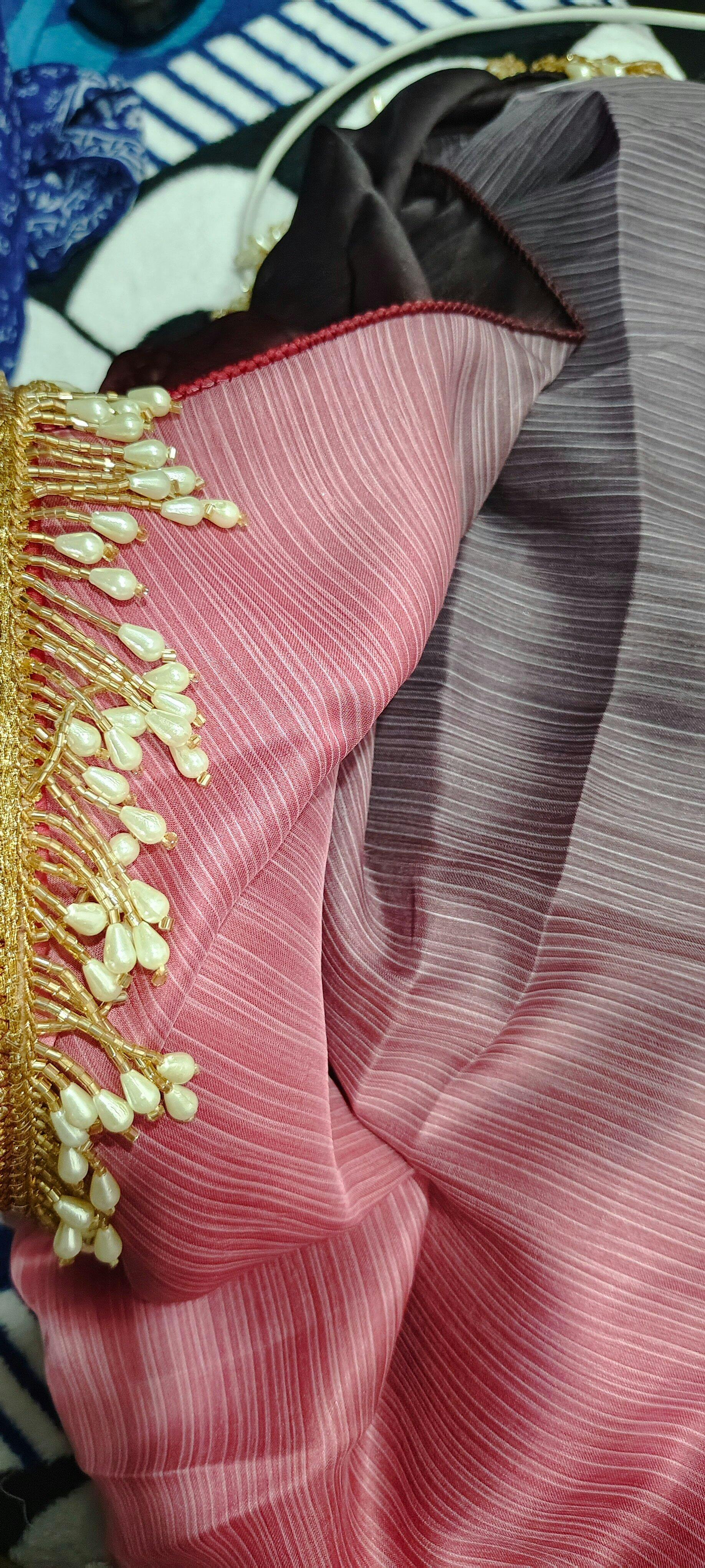2.Work: Dip-dyed in ombré shades. The saree pallu has a handmade pearl tassel border intricately sewn to it.