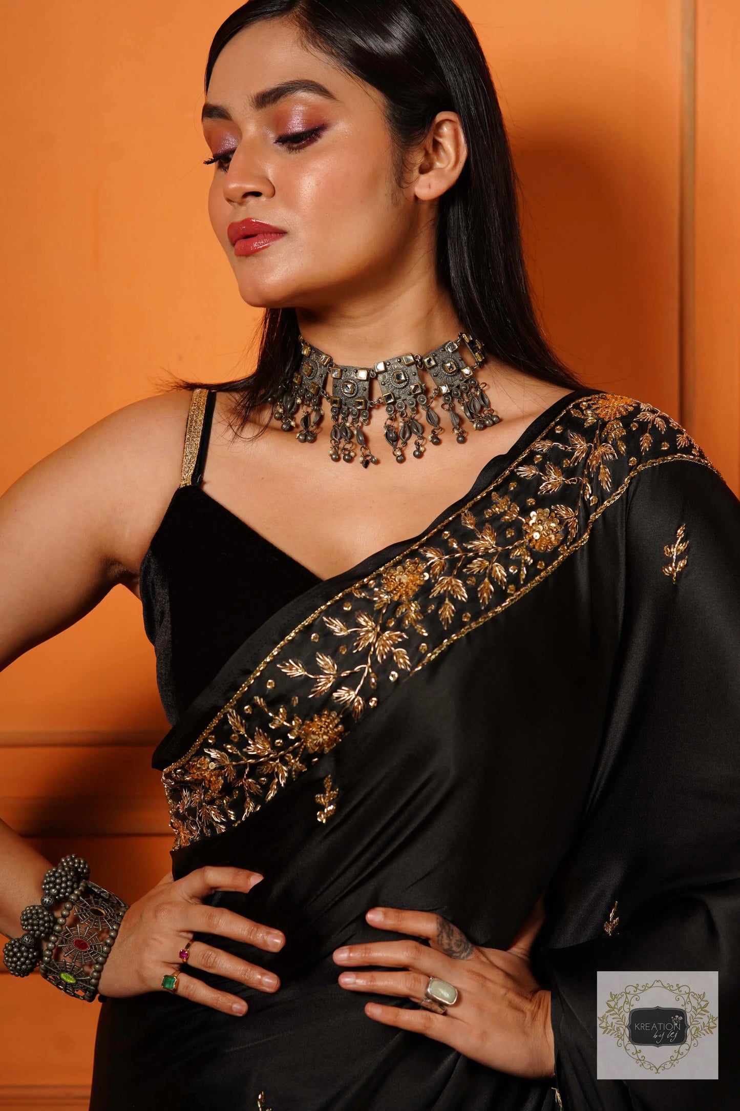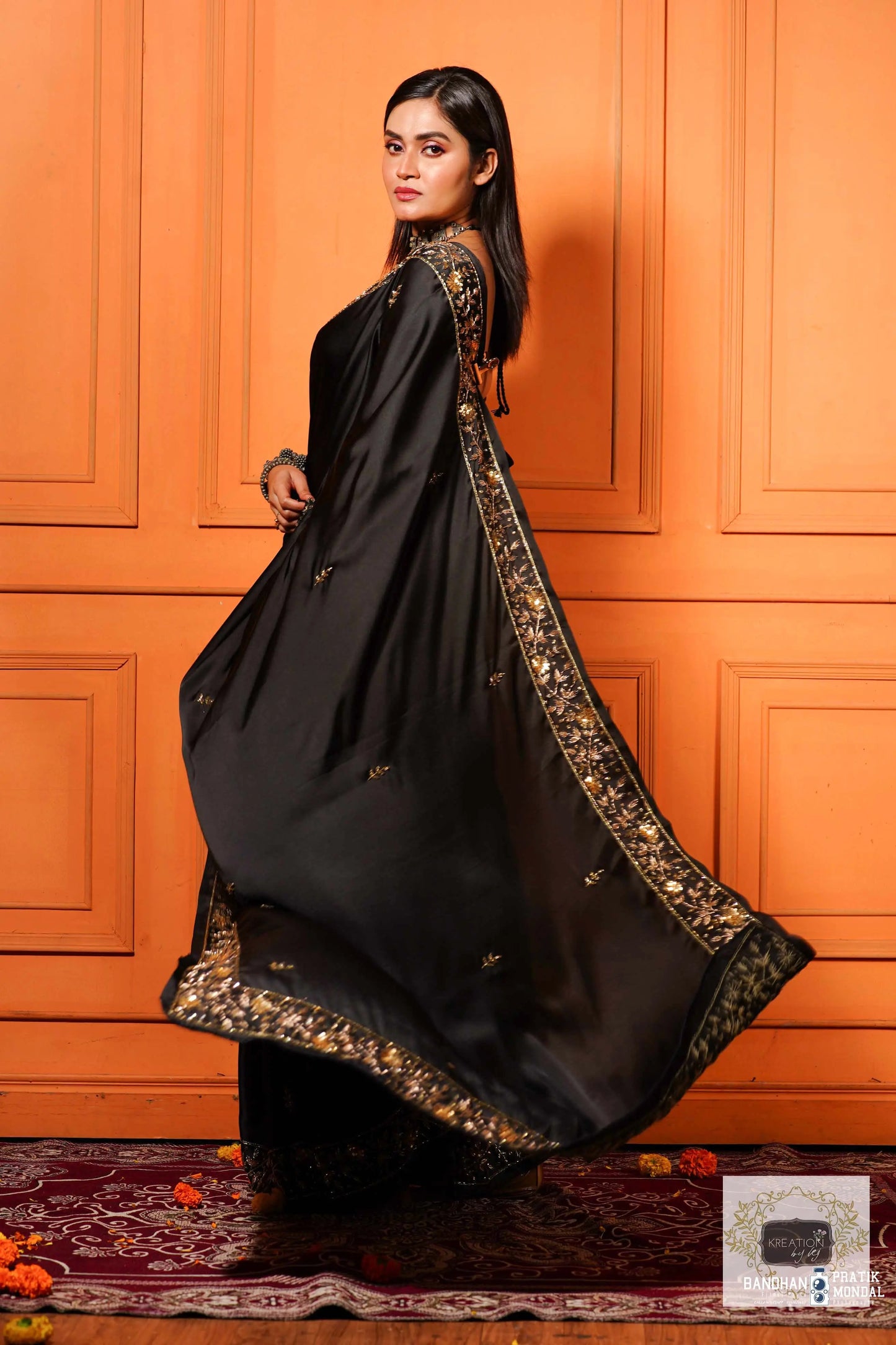 Elevate your wardrobe with the Black Satin Silk Anaya Saree, a rare find featuring exquisite handwork that adds a unique touch of elegance. Crafted from luxurious satin silk, this cocktail saree combines sophistication with artistry, making it perfect for special occasions where you want to stand out with refined style. Its rich black hue and intricate detailing ensure a timeless appeal that complements your expert fashion sense.