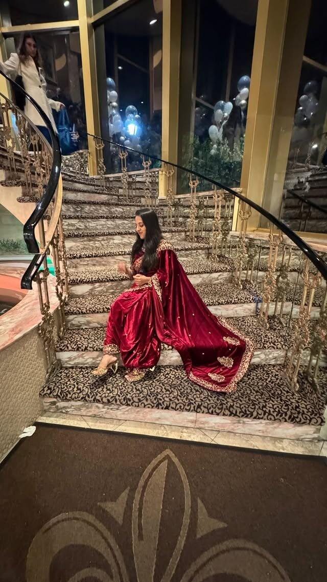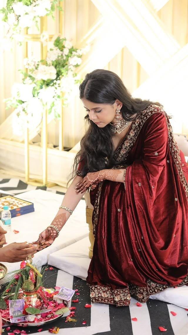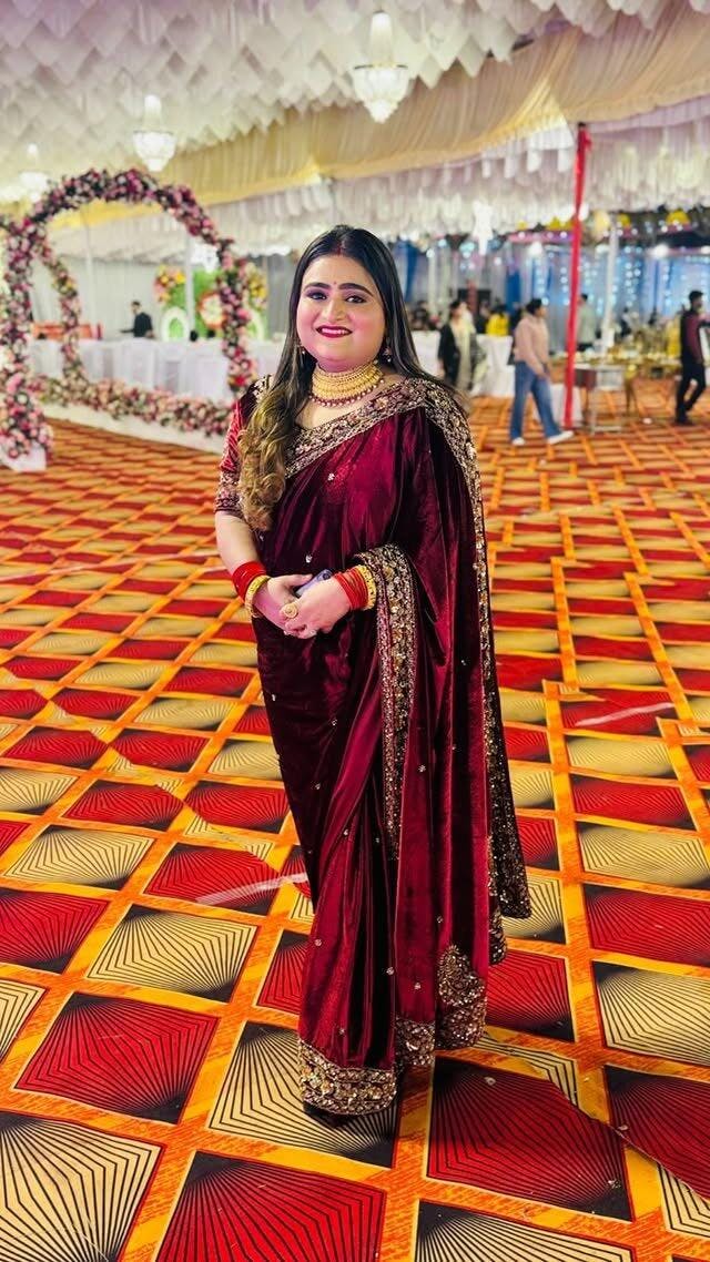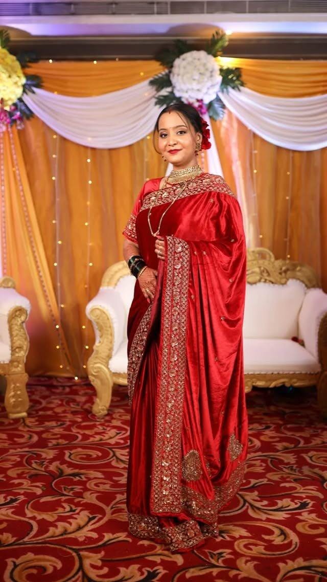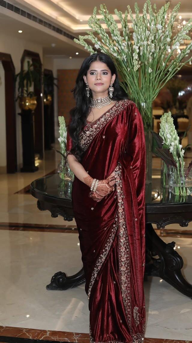 This handcrafted Zardosi saree is designed for brides seeking elegance. The intricate embroidery and luxurious velvet fabric make it ideal for weddings and reception