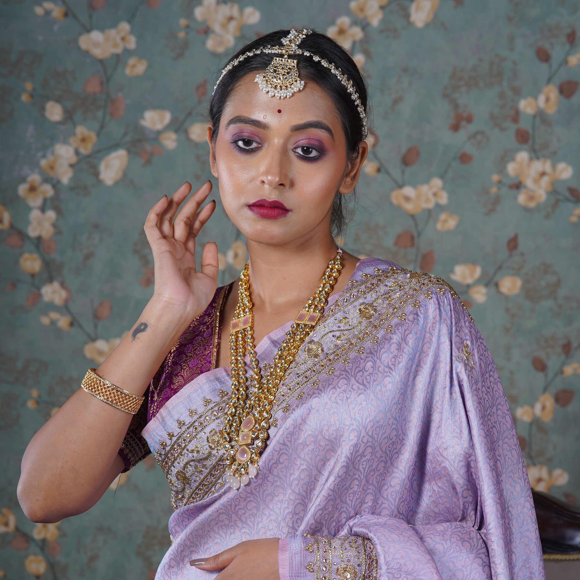 Body: Small bootis all over embroidered using cutdana the borders have been accentuated with a sequin and zari gota kiron lace