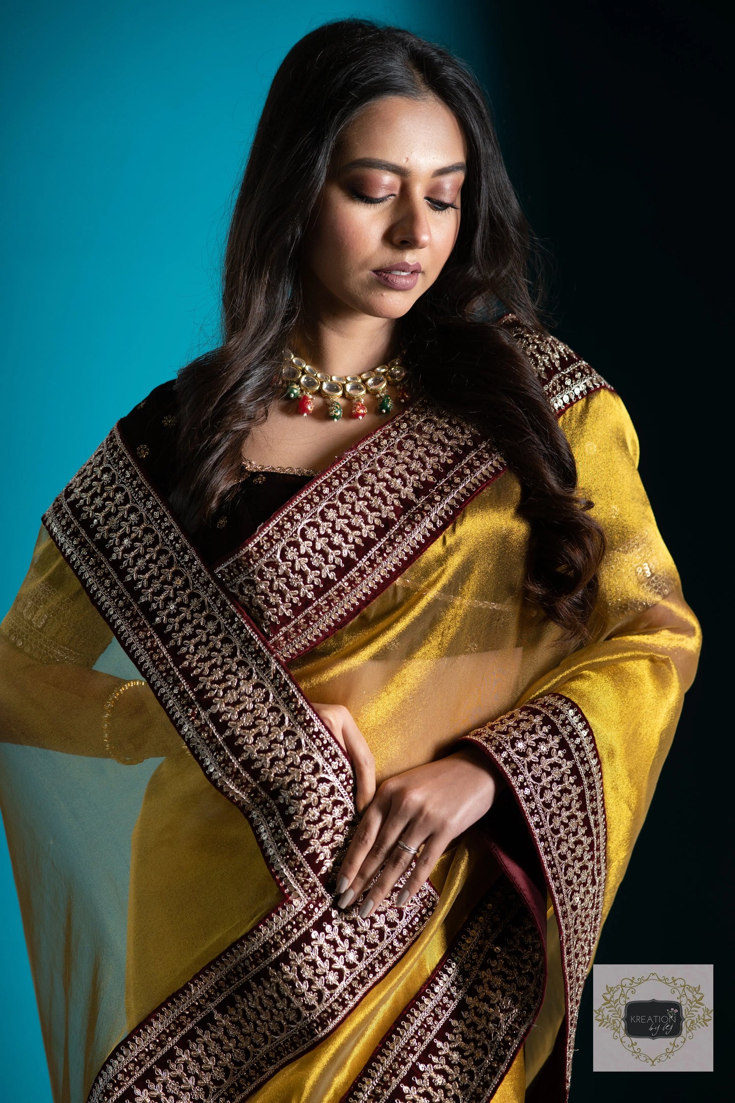 Experience timeless elegance with our Golden Zari Tissue Saree featuring a rich Maroon Border. Crafted from fine tissue fabric, this saree offers a lightweight yet luxurious drape accented by intricate zari work that adds a subtle shimmer perfect for festive and formal occasions. The combination of gold and maroon creates a sophisticated contrast, enhancing your grace and style effortlessly. Ideal for traditional events, this saree blends classic craftsmanship with contemporary appeal, making it an essential addition to your ethnic wardrobe.