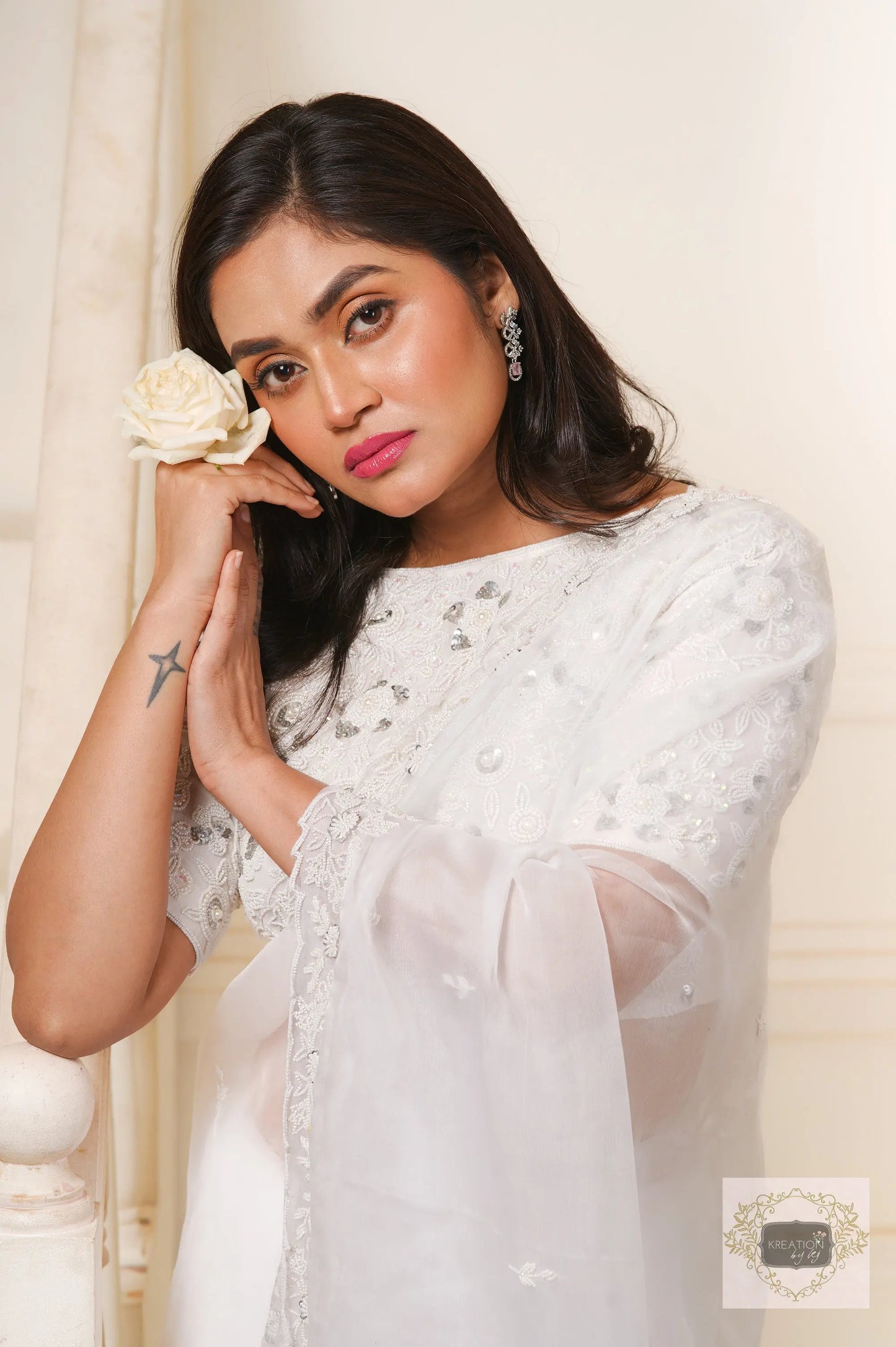 2.Work: Handembroidered sequin and pearls in white all over the border in floral pattern.