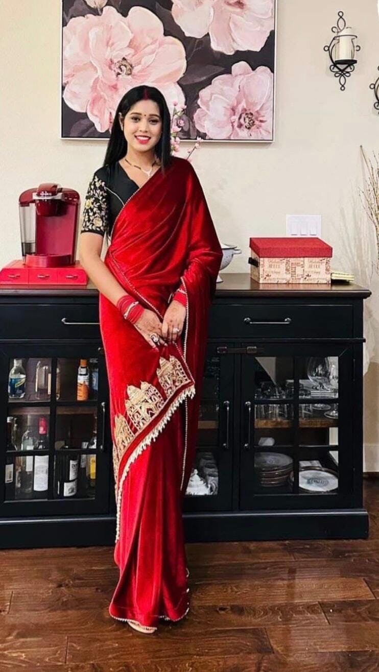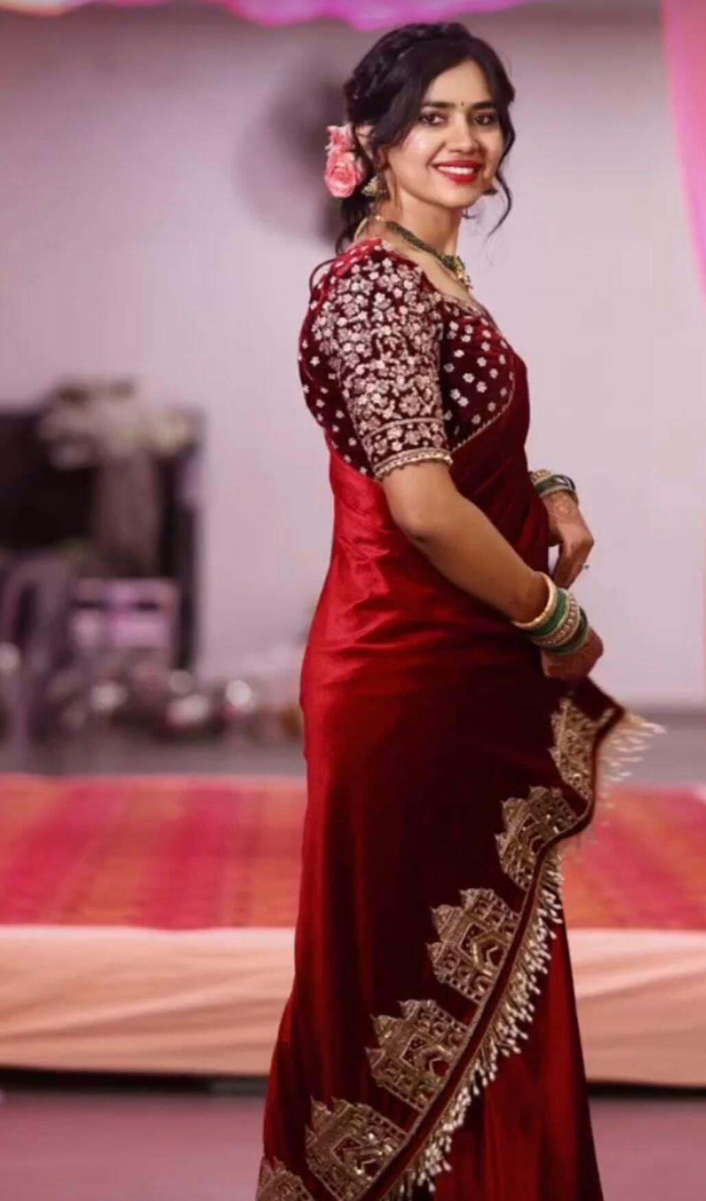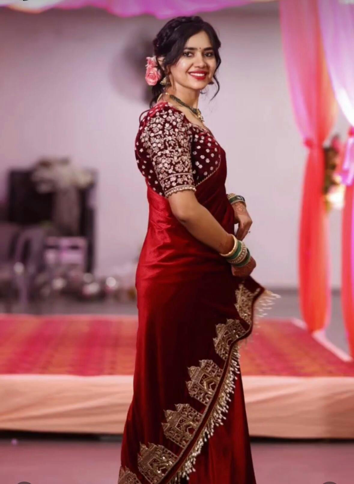Maroon Velvet Zardosi Embroidered Saree With Blouse