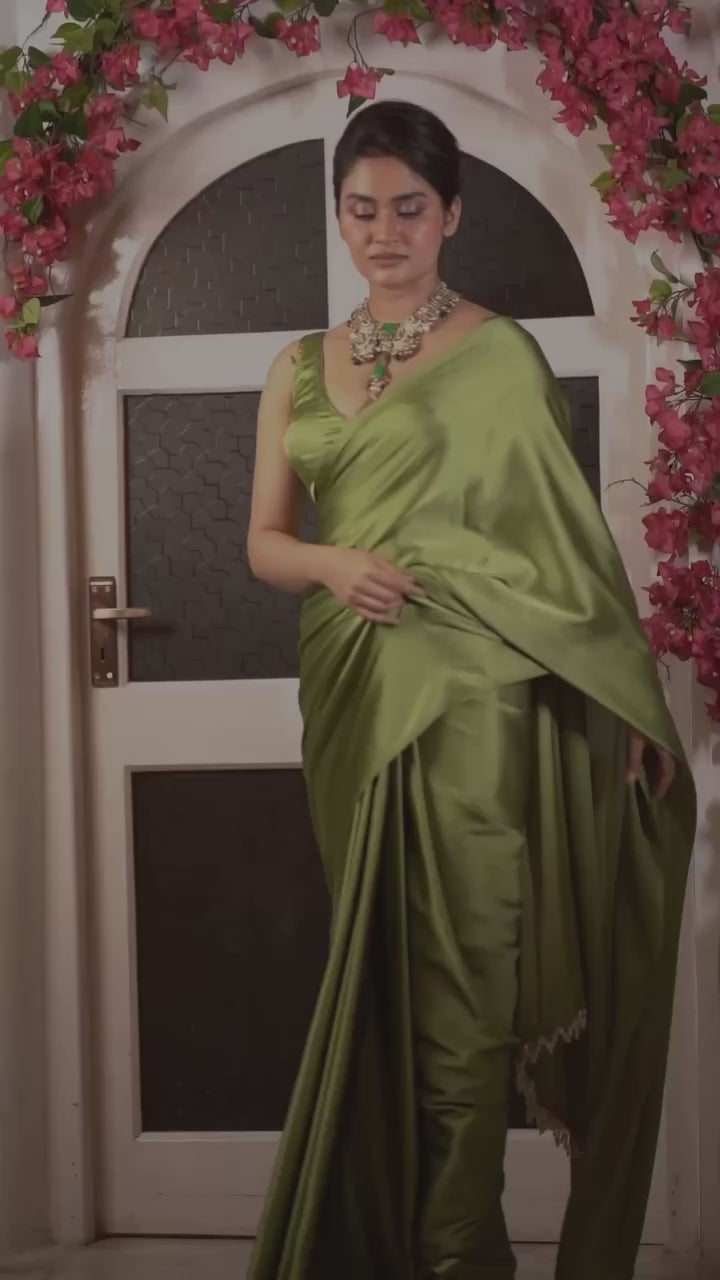 Moss Green Satin Silk Saree with Handmade Tassels on Pallu