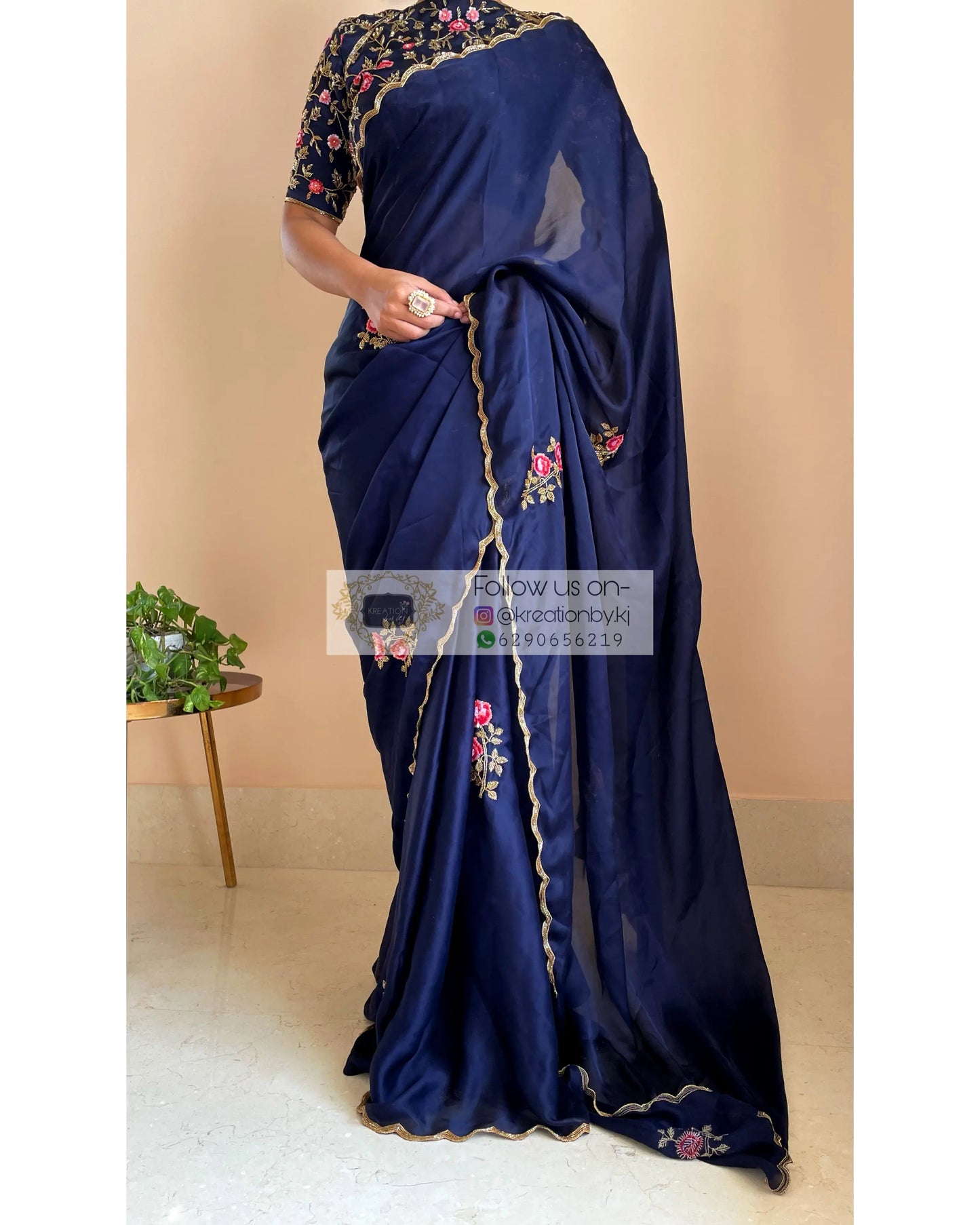 2.Work: Fine hand embroidered rose motifs all over the body. The roses have been embroidered intricately using colourful sequins and cutdana. The saree borders have been scalloped using fine cutdana beads.