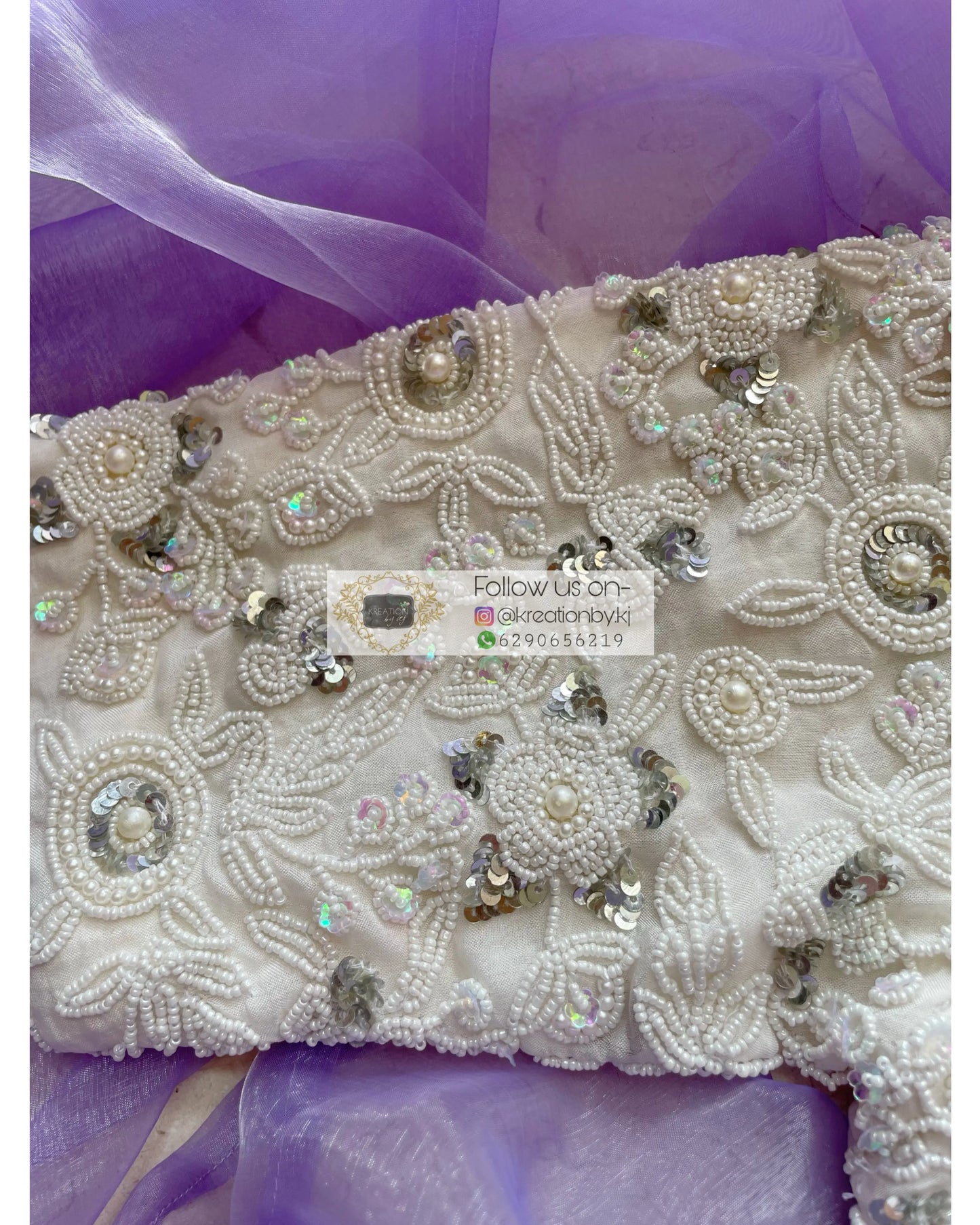 Step into the spotlight with this white swan blouse, lavishly embroidered with silver sequins and pearls. Inspired by bridal grace and swan-like poise, this designer blouse combines intricate craftsmanship with ultra-feminine detailing – perfect for weddings, sangeets, receptions, or cocktail parties.