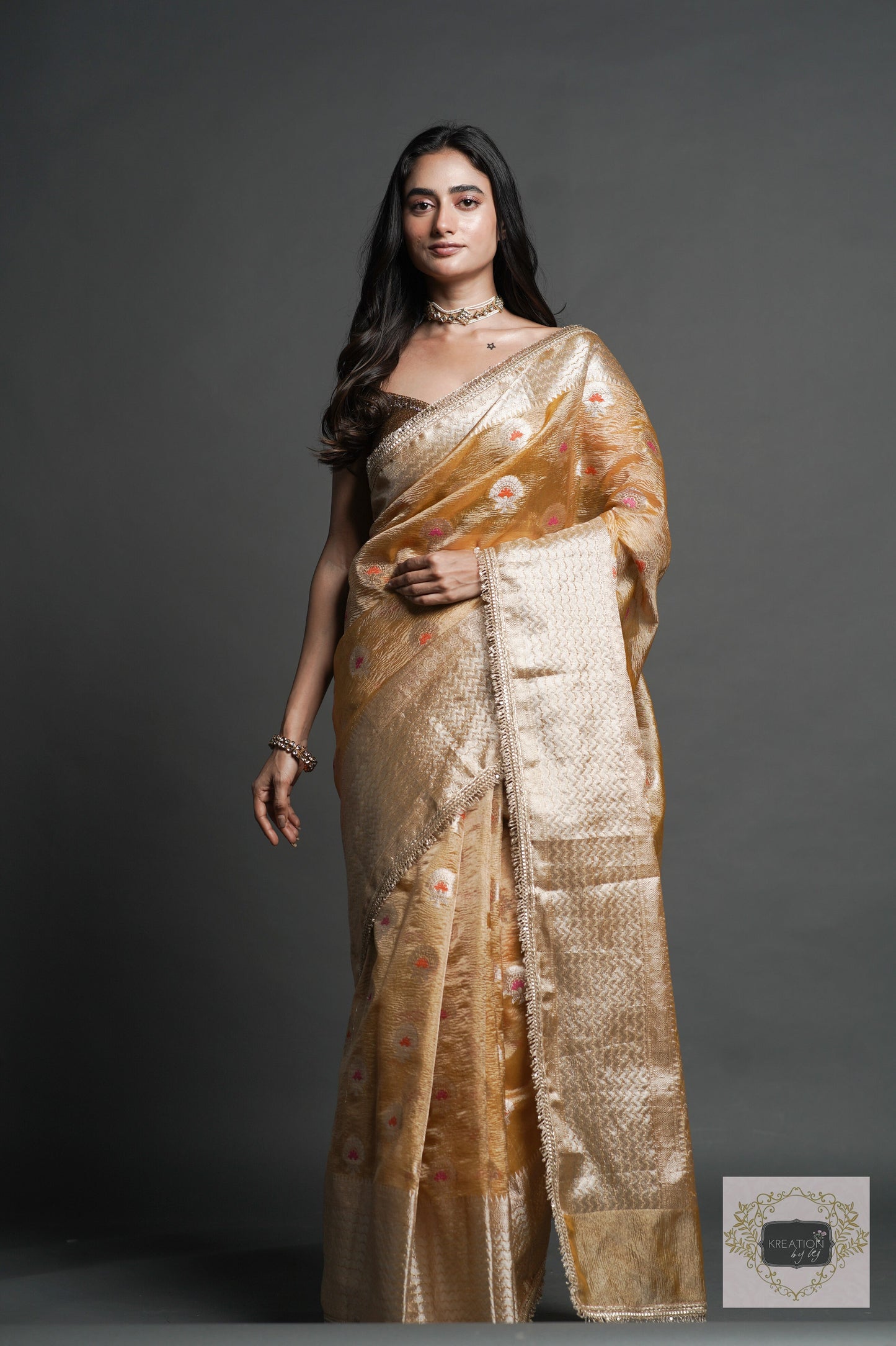 Yellow Crushed Tissue Banarasi Saree with Gota Border