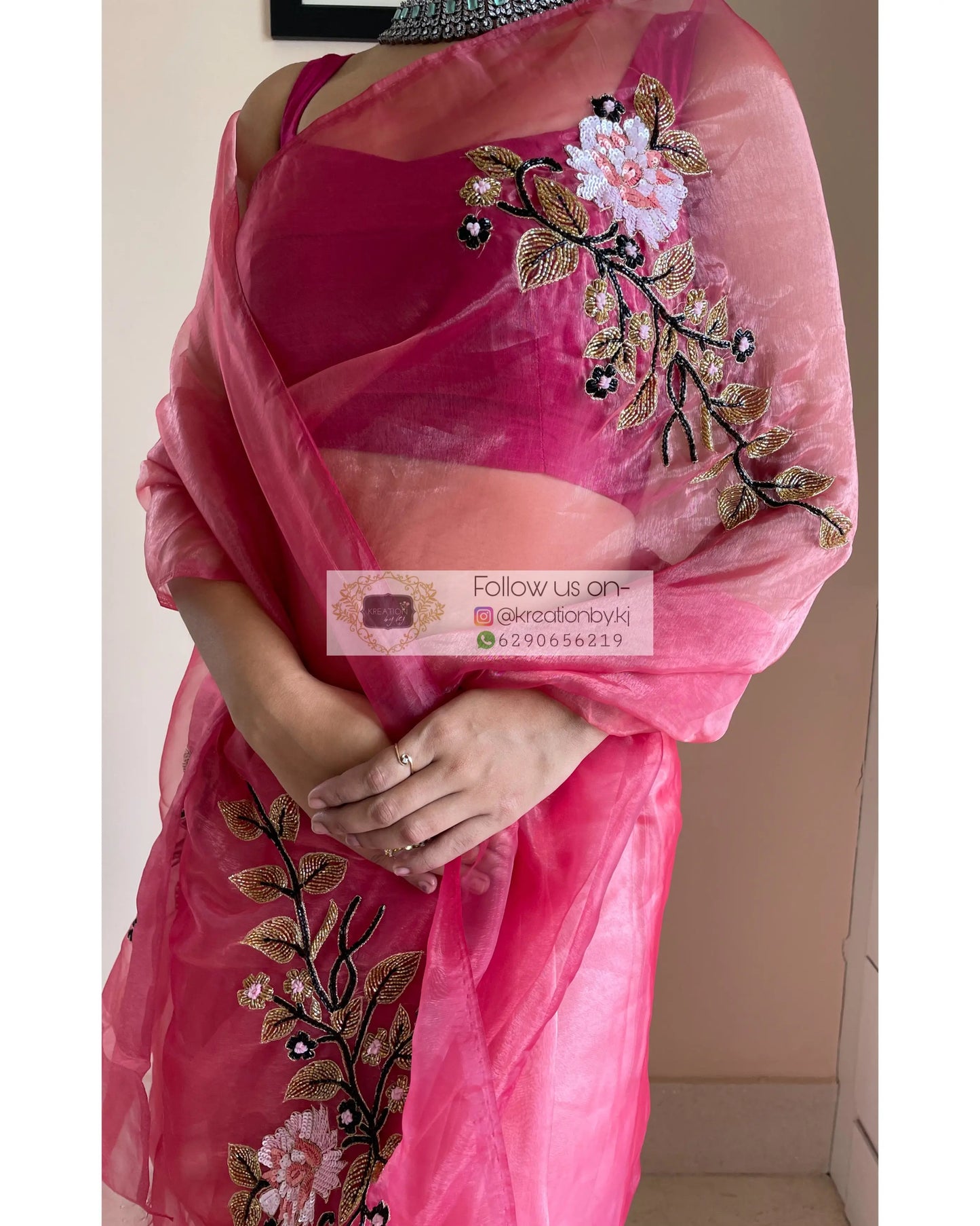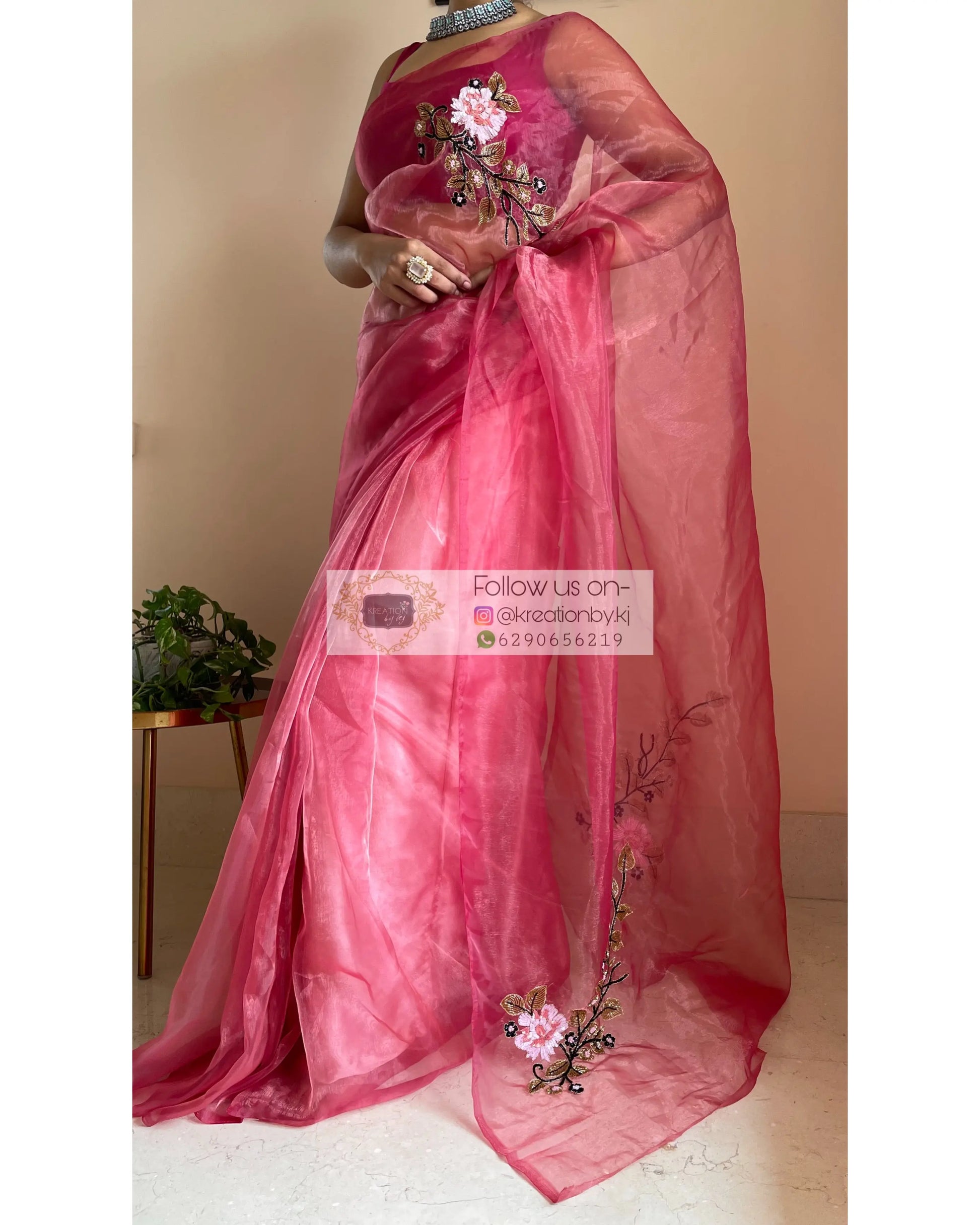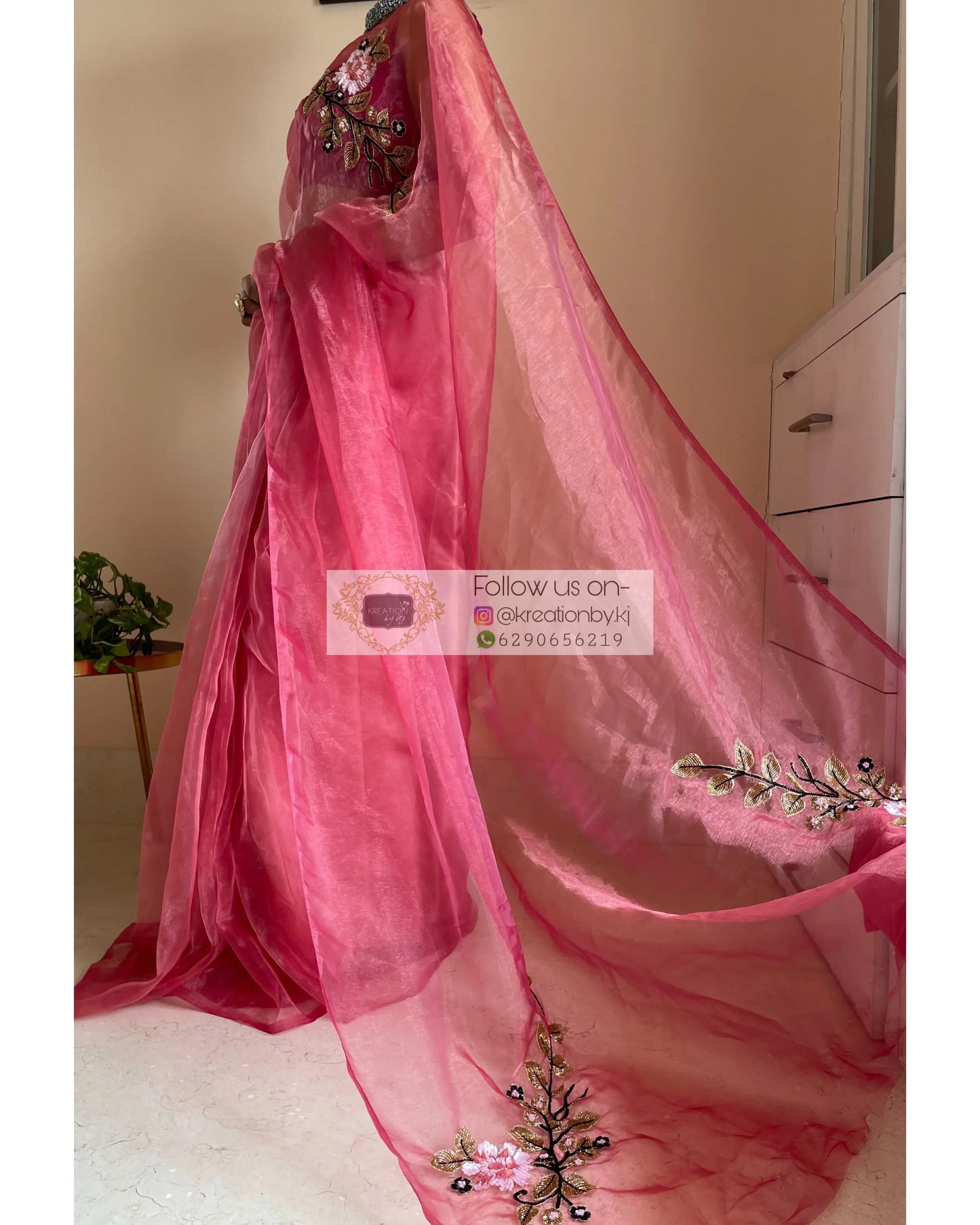 Pink Glass Tissue Saree With Handembroidered Floral Motifs