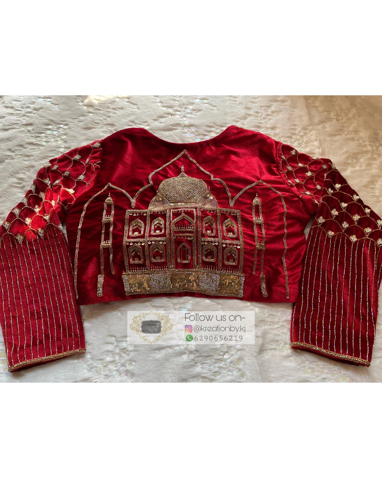 Maroon Velvet Designer Zardosi Hand-Embroidered Taj Mahal Blouse